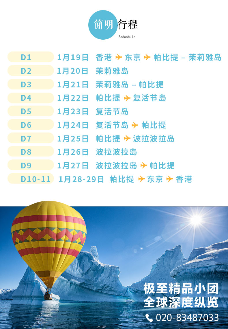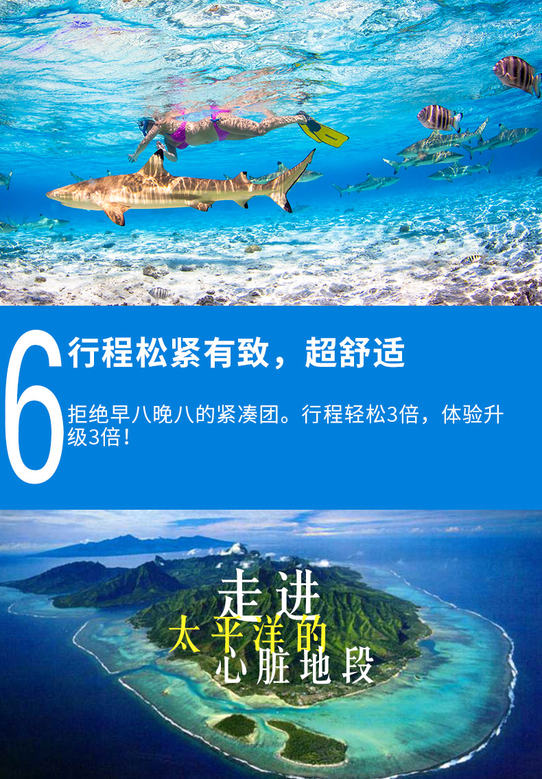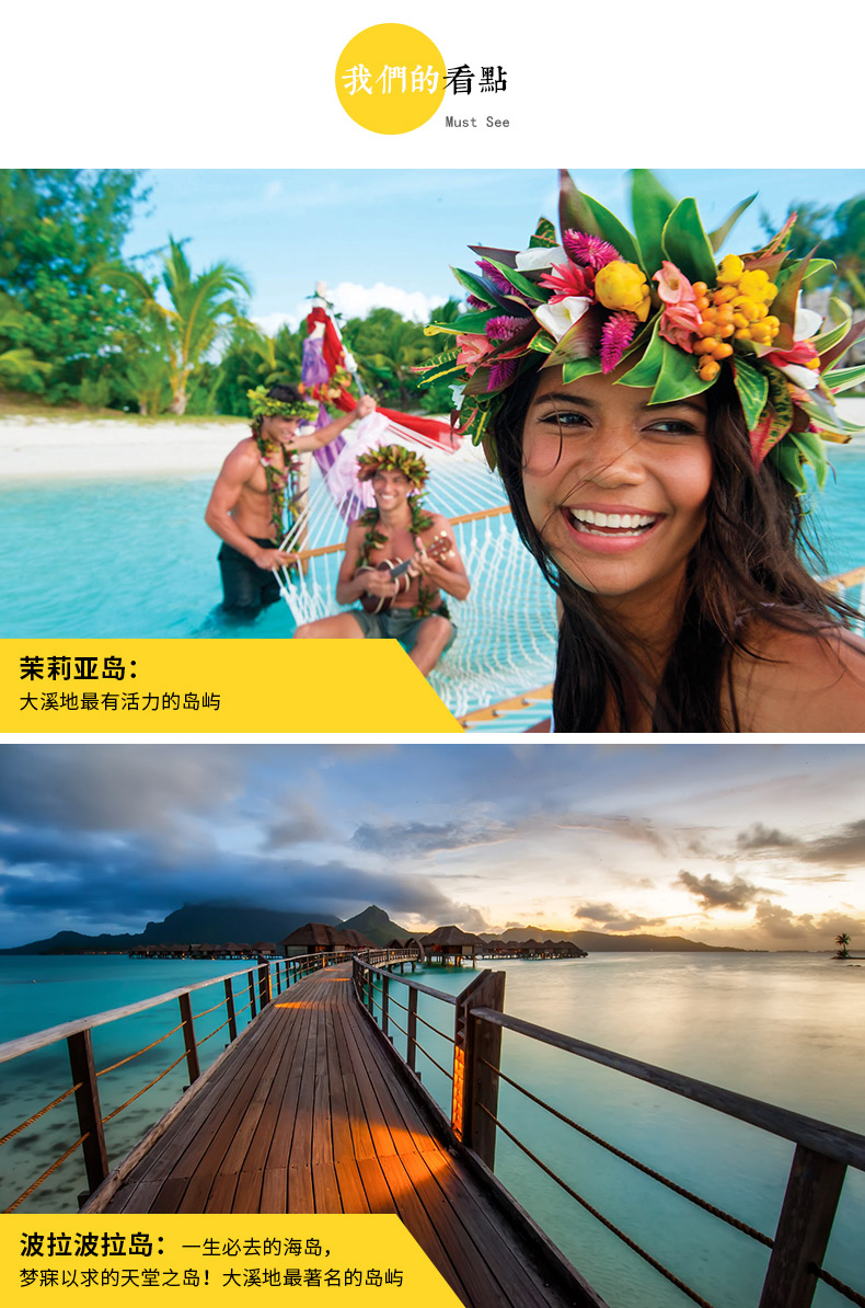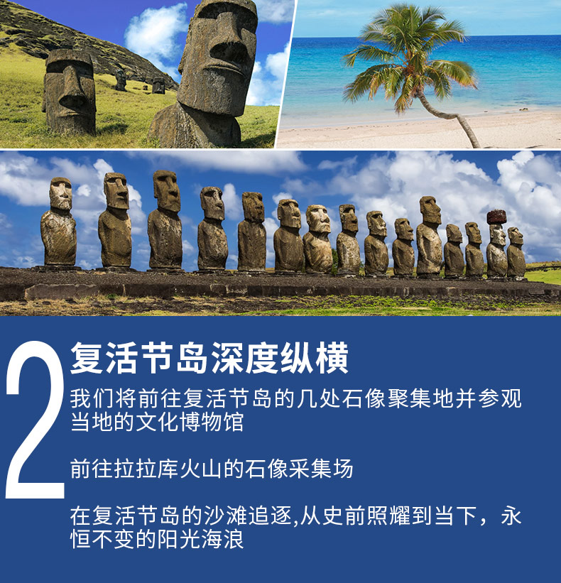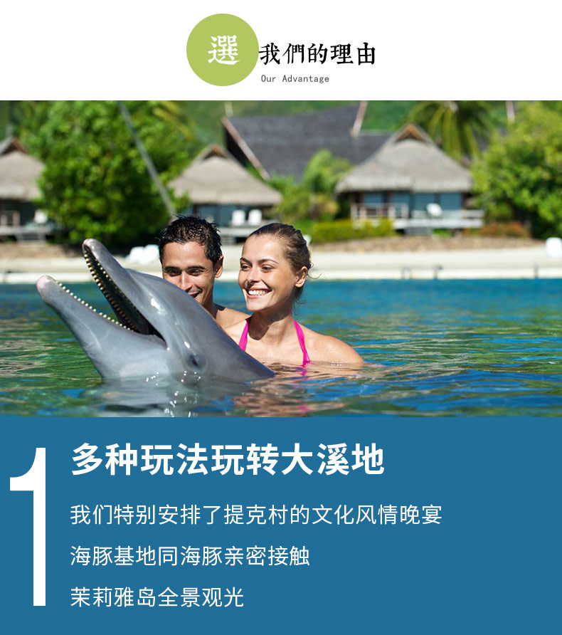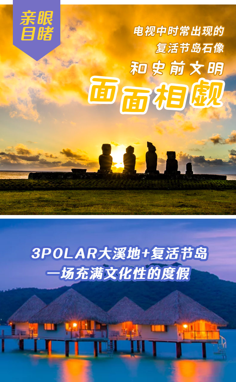 大溪地+复活节岛的特色组合/充足的自由活动时间/多种多样的活动选择/和海豚亲密接触/亲眼目睹波利尼西亚史前文明的巨石雕像/地球唯一坐海观山的奇景/