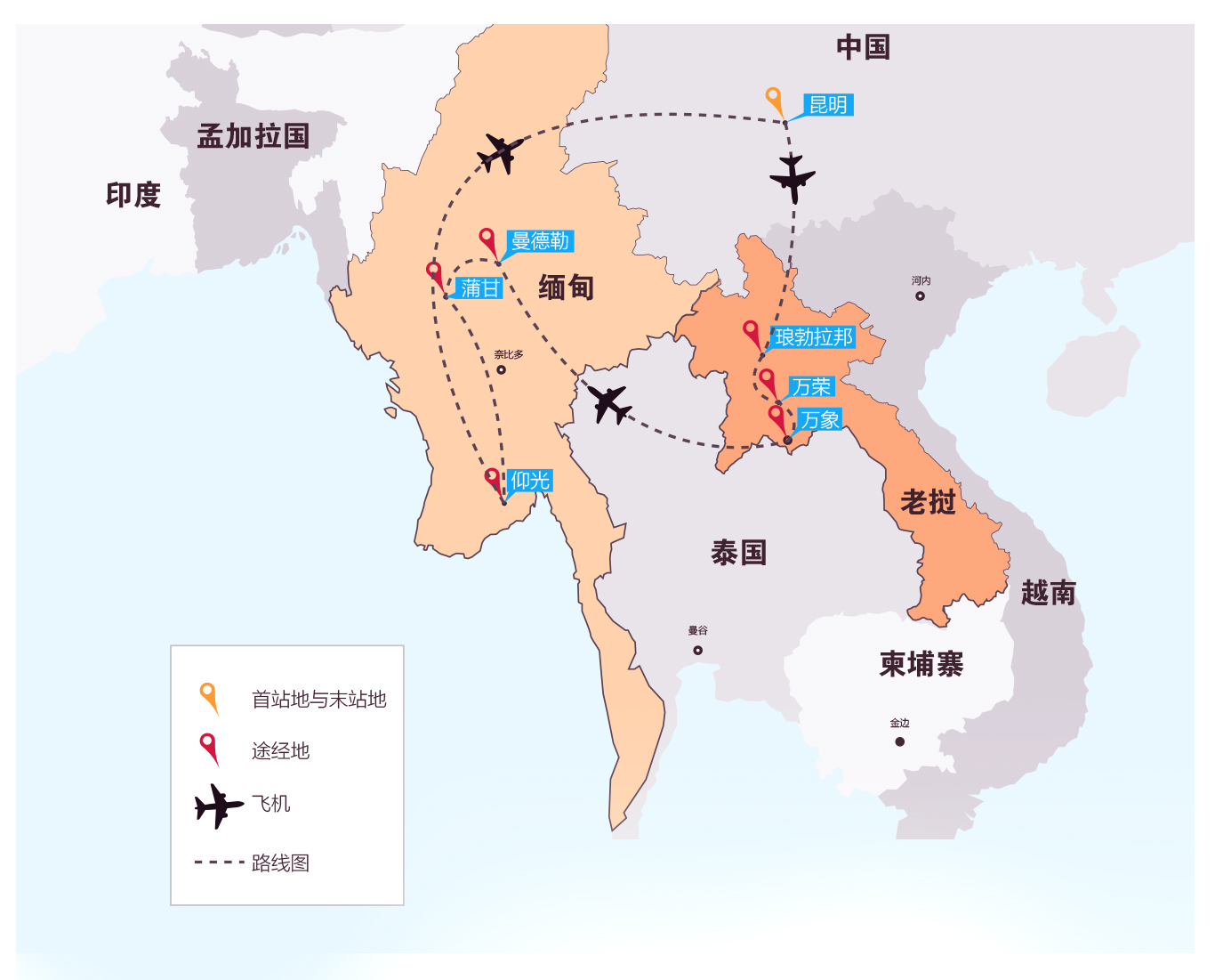 1. 国际段机票费:经济舱(昆明 – 琅勃拉邦;仰光 –昆明; 万象 – 曼德勒)机票费用(含燃油税/离境税费),实际票价与税金,以出票为准;