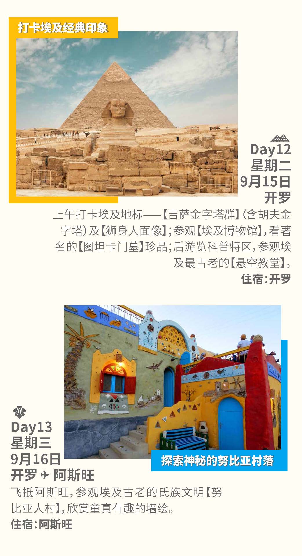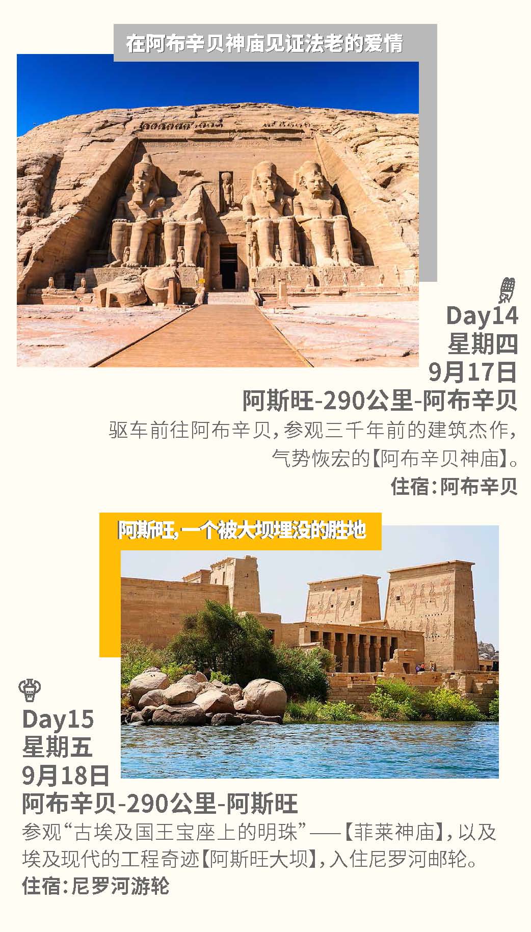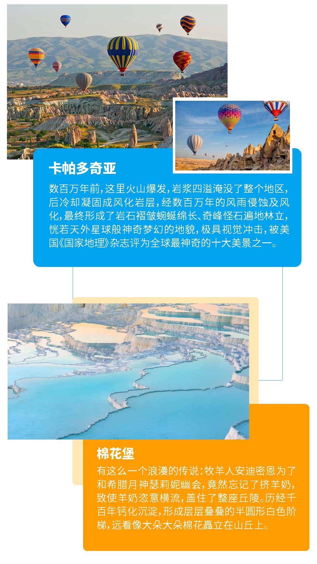 乘坐五星级游船沿着尼罗河饱览法老们的千年遗产;埃及胡夫金字塔、阿布辛贝神庙、帝王谷、黑白沙漠;土耳其卡帕多奇亚、棉花堡等经典景点。