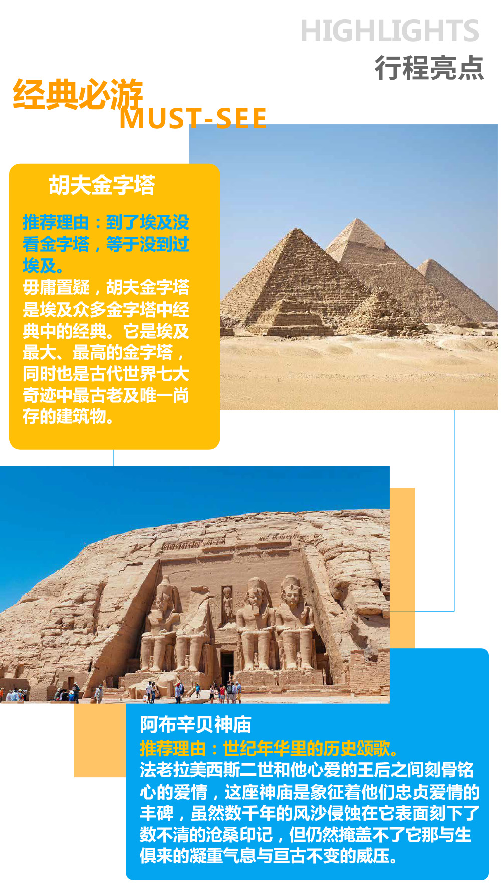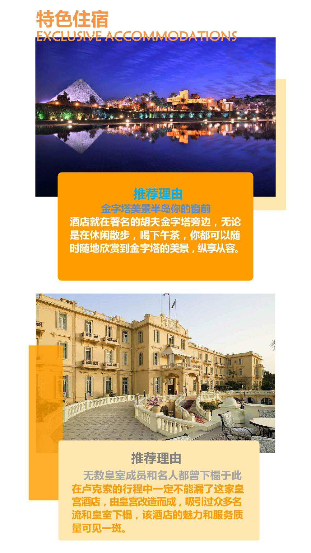 我们将乘坐五星级游船, 沿着尼罗河饱览法老们的千年遗产。 精心挑选富有历史感和当地风情的豪奢酒店, 跟随19世纪黄金年代的人们的足迹, 一起优雅地探索古埃及, 感受神秘的尼罗河风情。