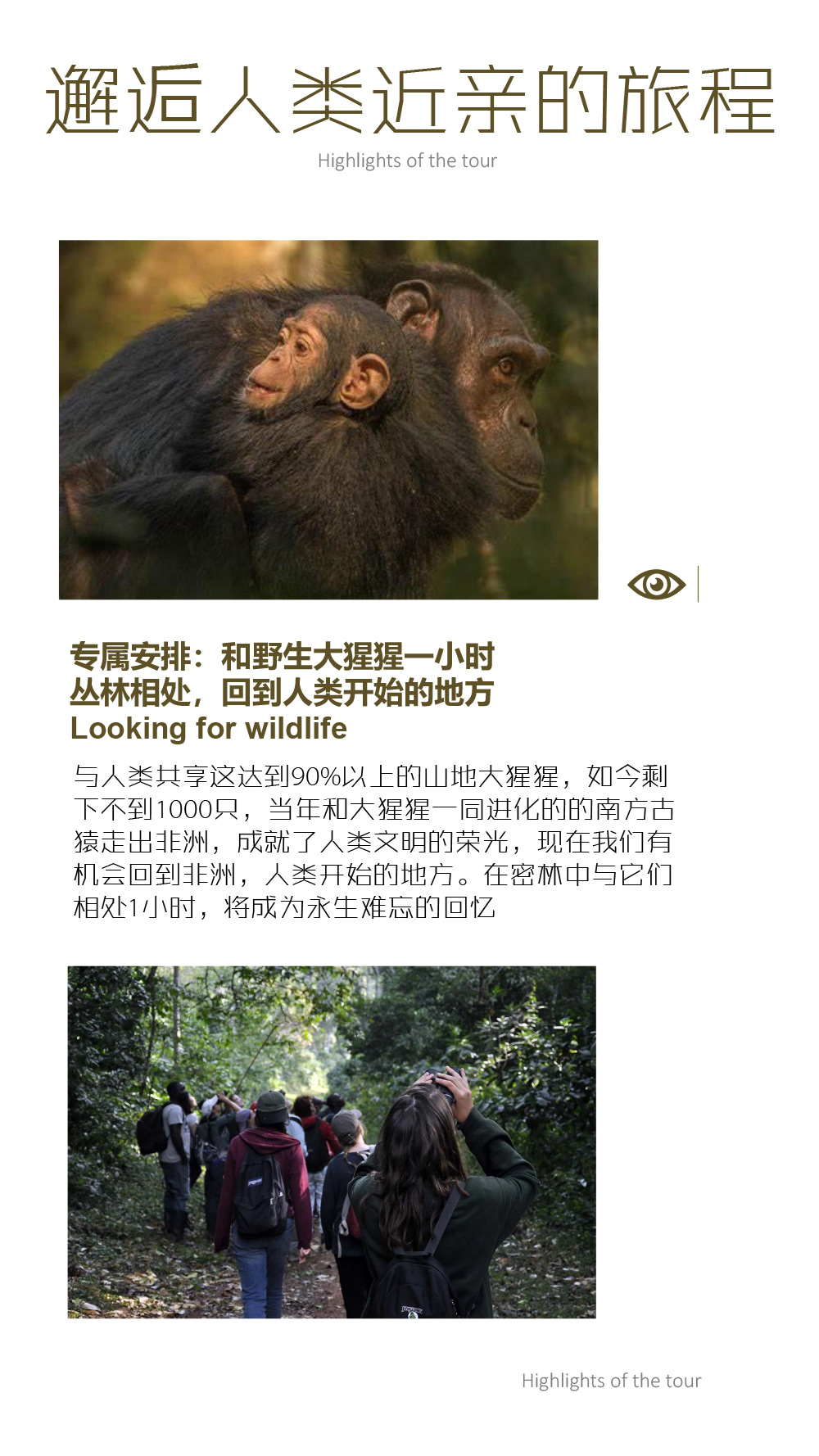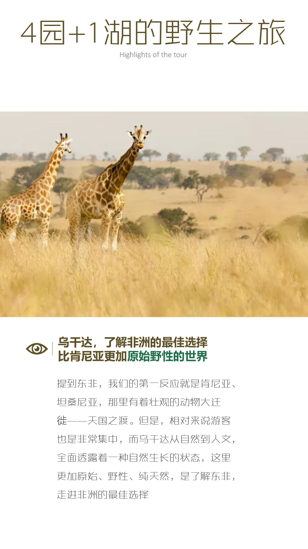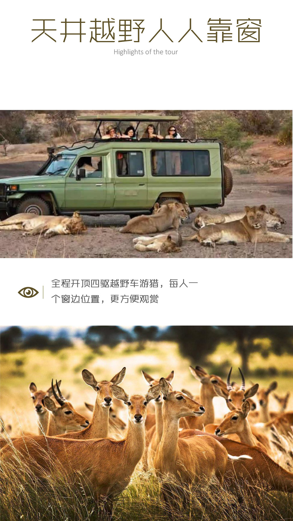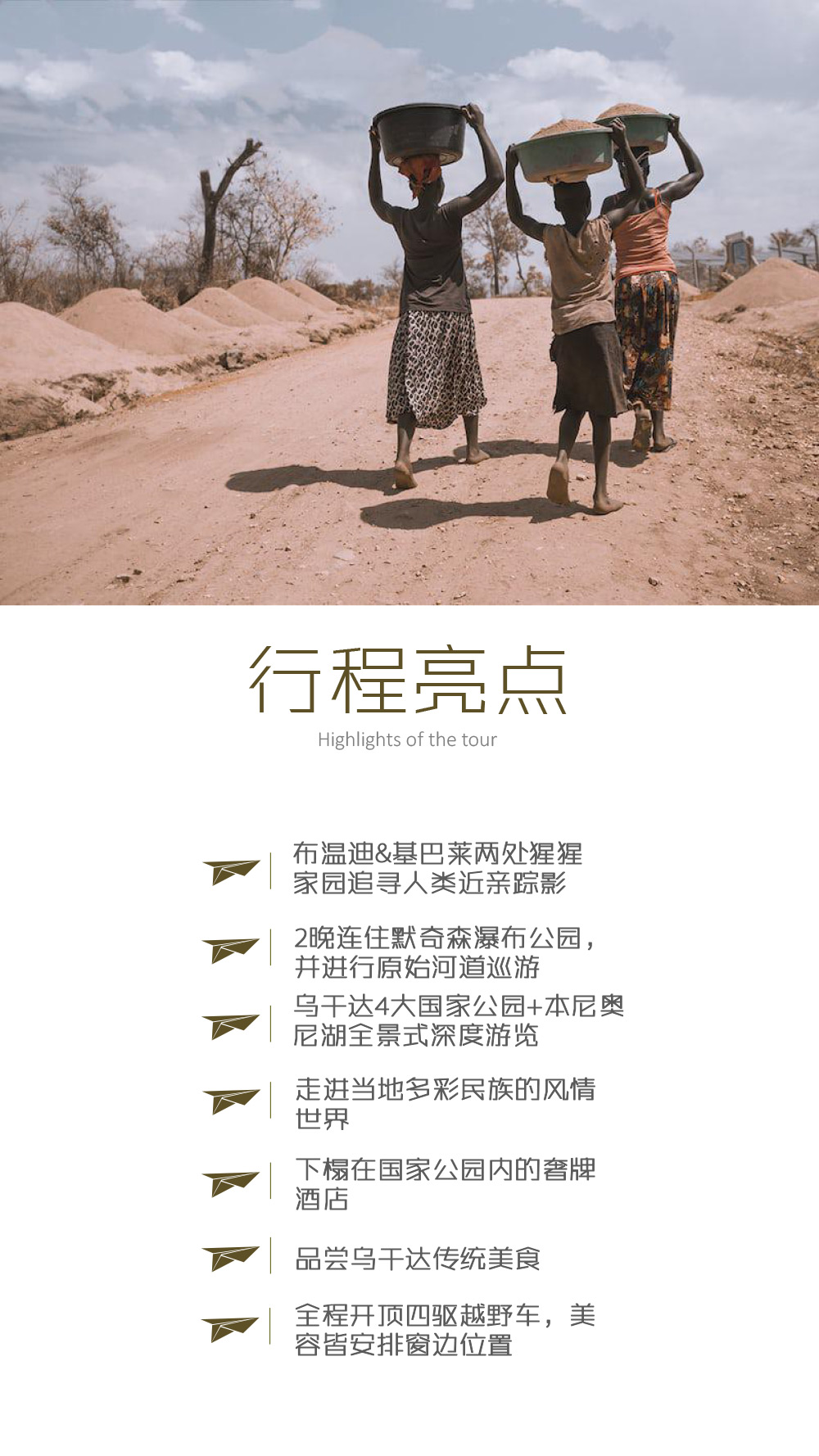 布温迪&基巴莱两处猩猩家园追寻人类近亲踪影;2晚连住默奇森瀑布公园,并进行原始河道巡游;乌干达4大国家公园+本尼奥,尼湖全景式深度游览;走进当地多彩民族的风情世界;下榻在国家公园内的奢牌酒店;品尝乌干达传统美食;全程开顶四驱越野车,美 容皆安排窗边位置