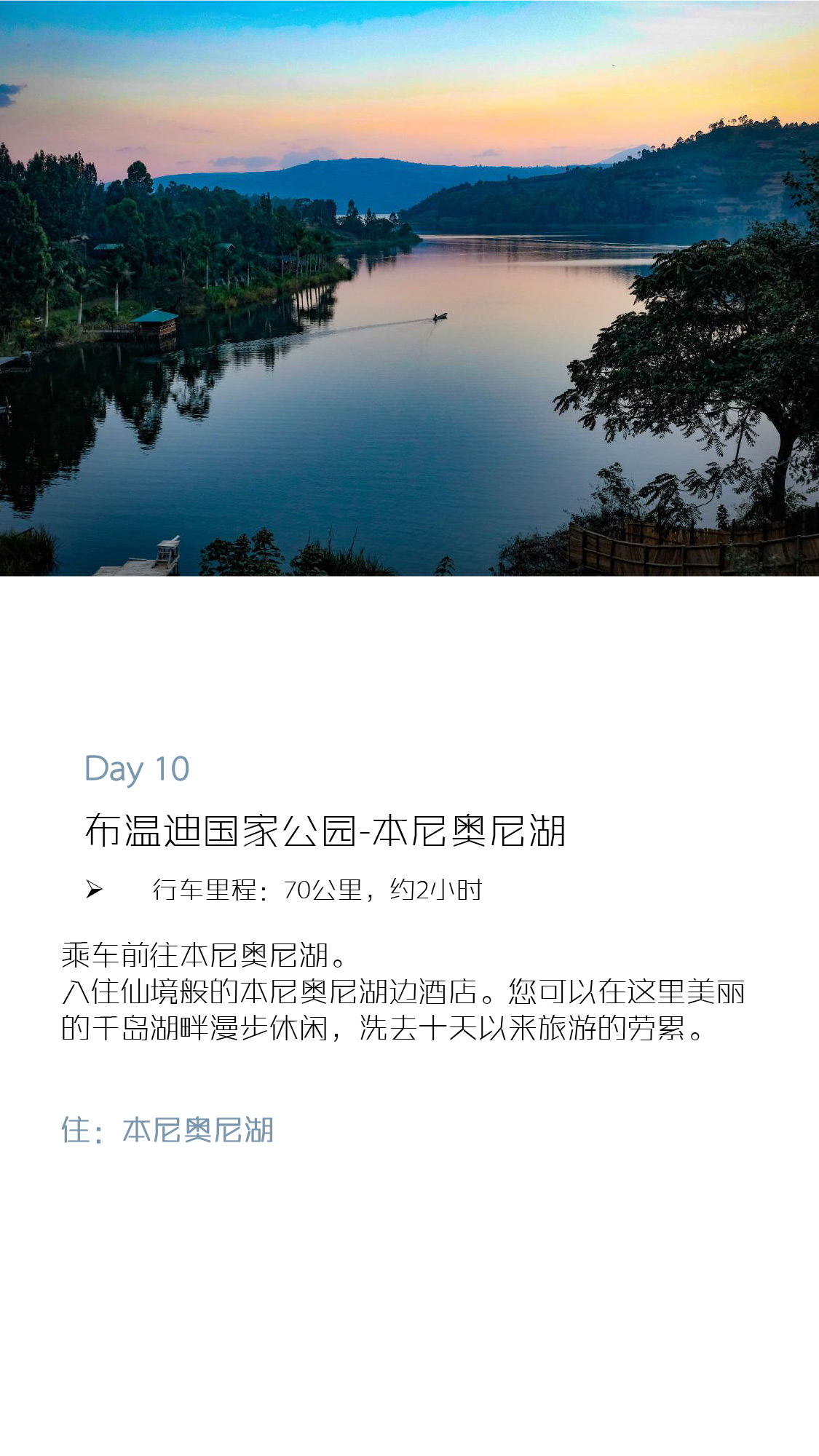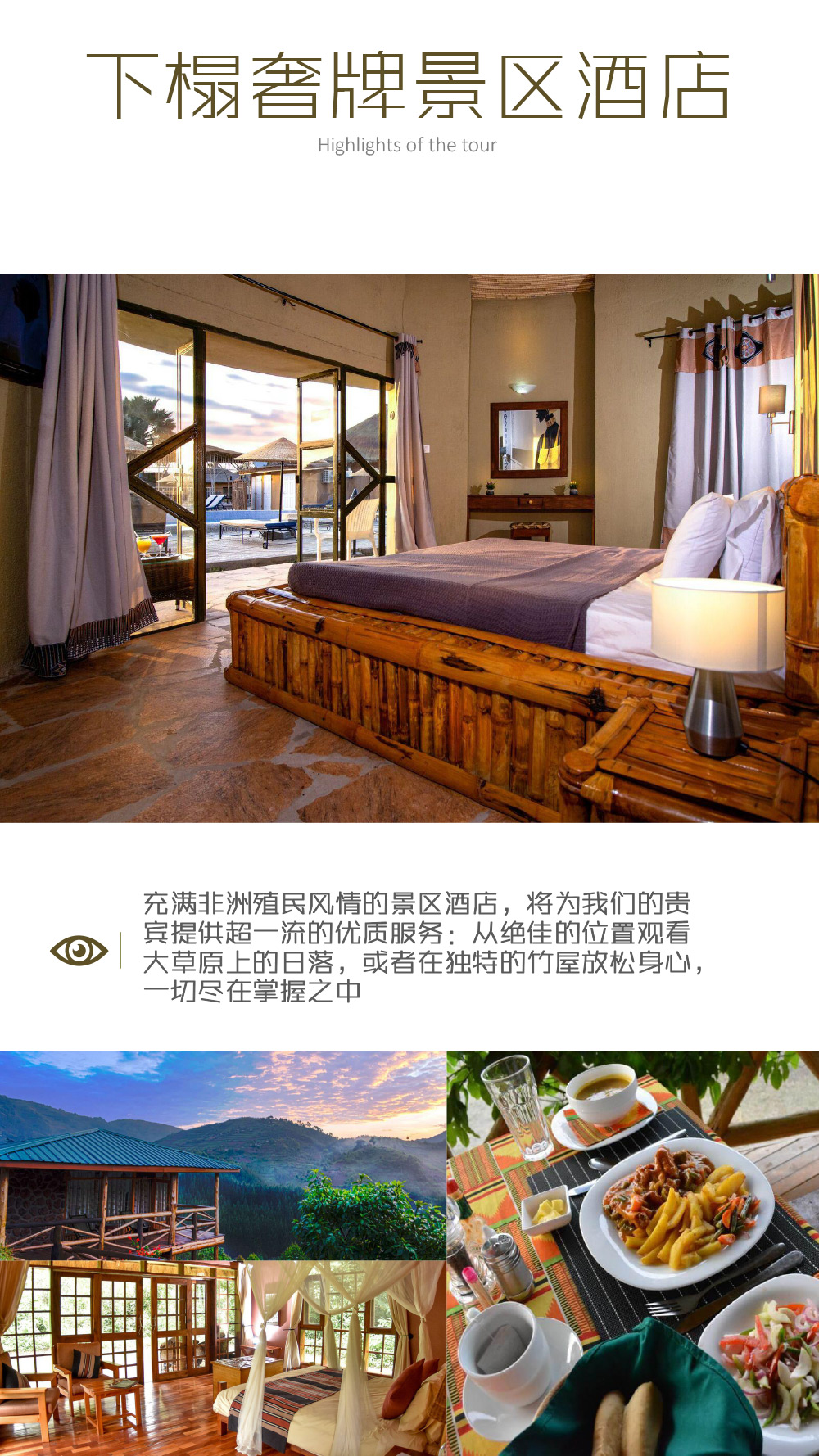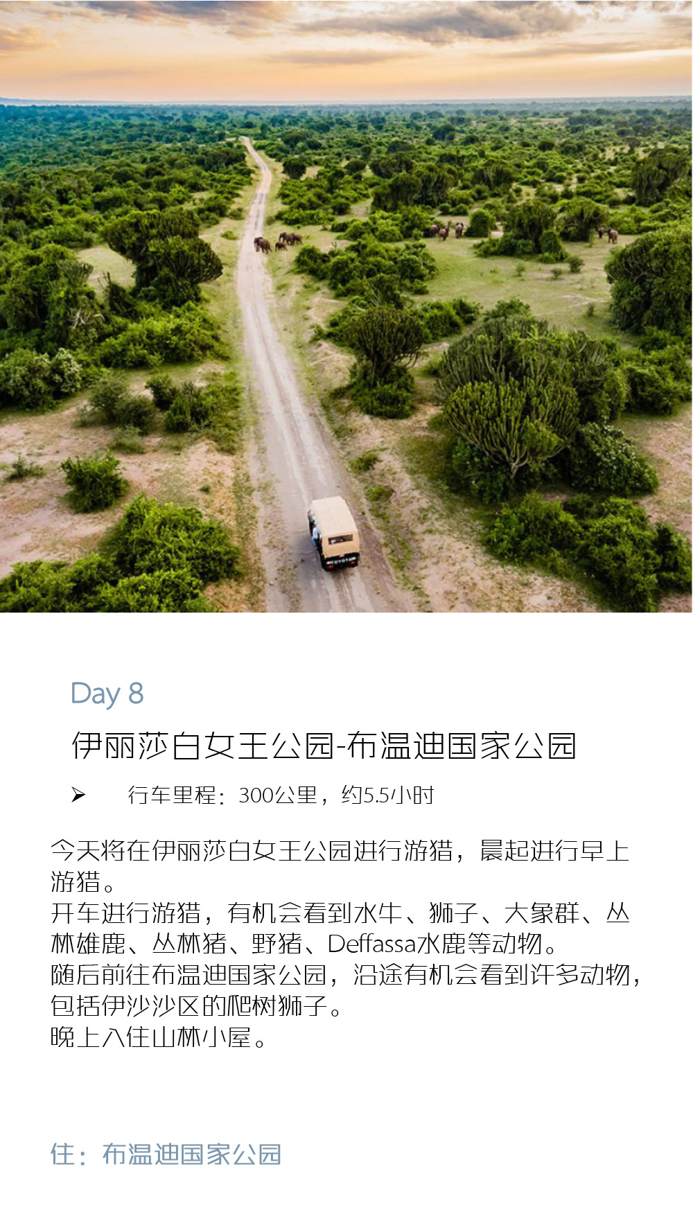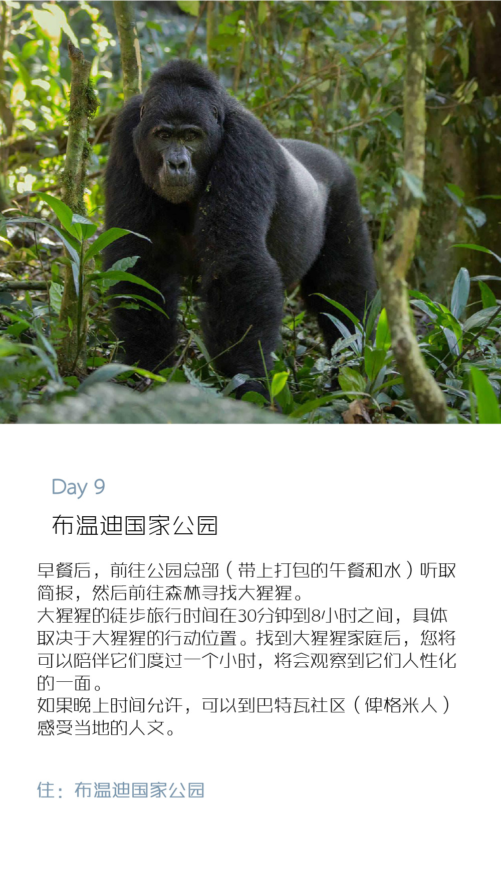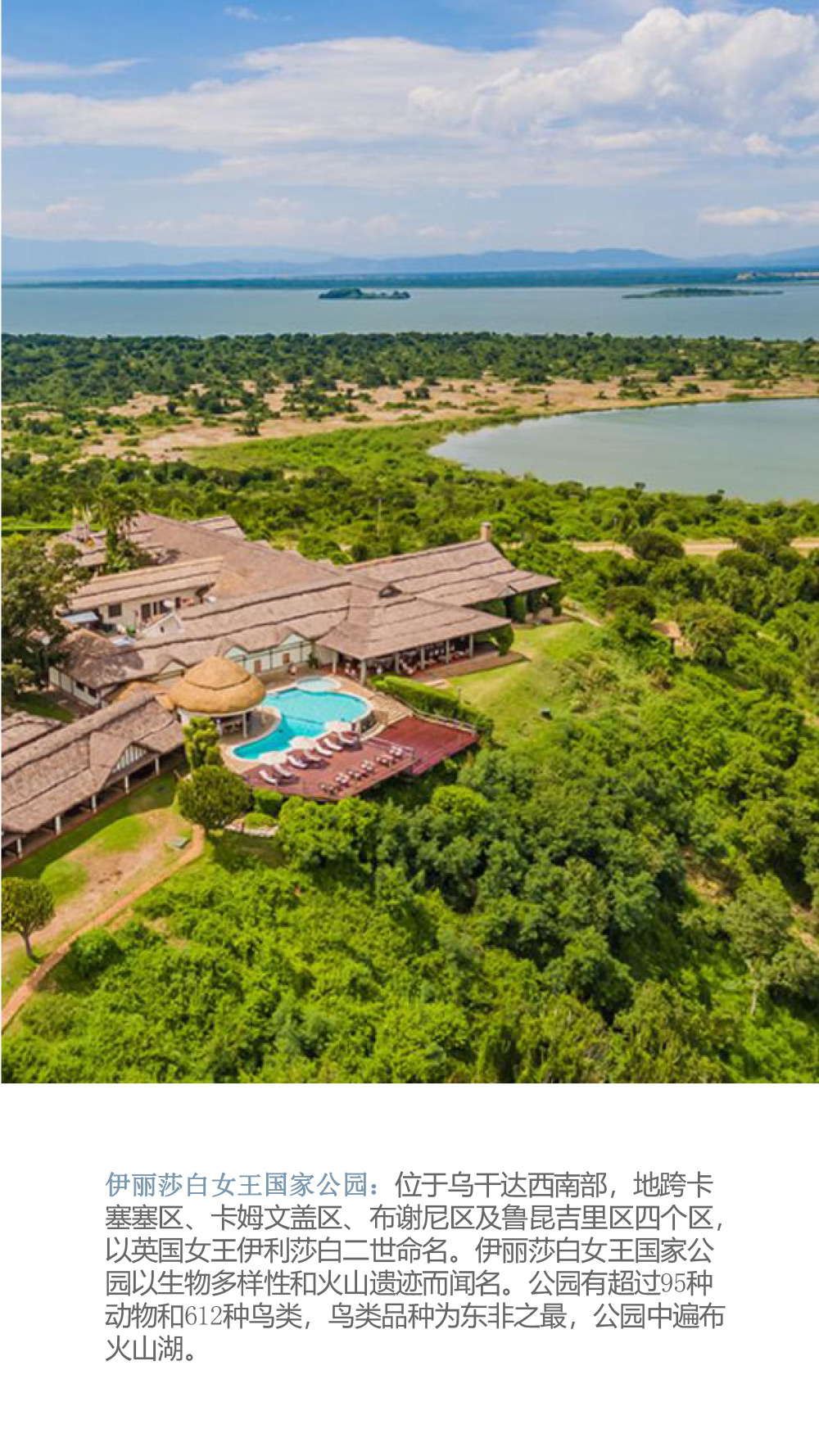 布温迪&基巴莱两处猩猩家园追寻人类近亲踪影;2晚连住默奇森瀑布公园,并进行原始河道巡游;乌干达4大国家公园+本尼奥,尼湖全景式深度游览;走进当地多彩民族的风情世界;下榻在国家公园内的奢牌酒店;品尝乌干达传统美食;全程开顶四驱越野车,美 容皆安排窗边位置