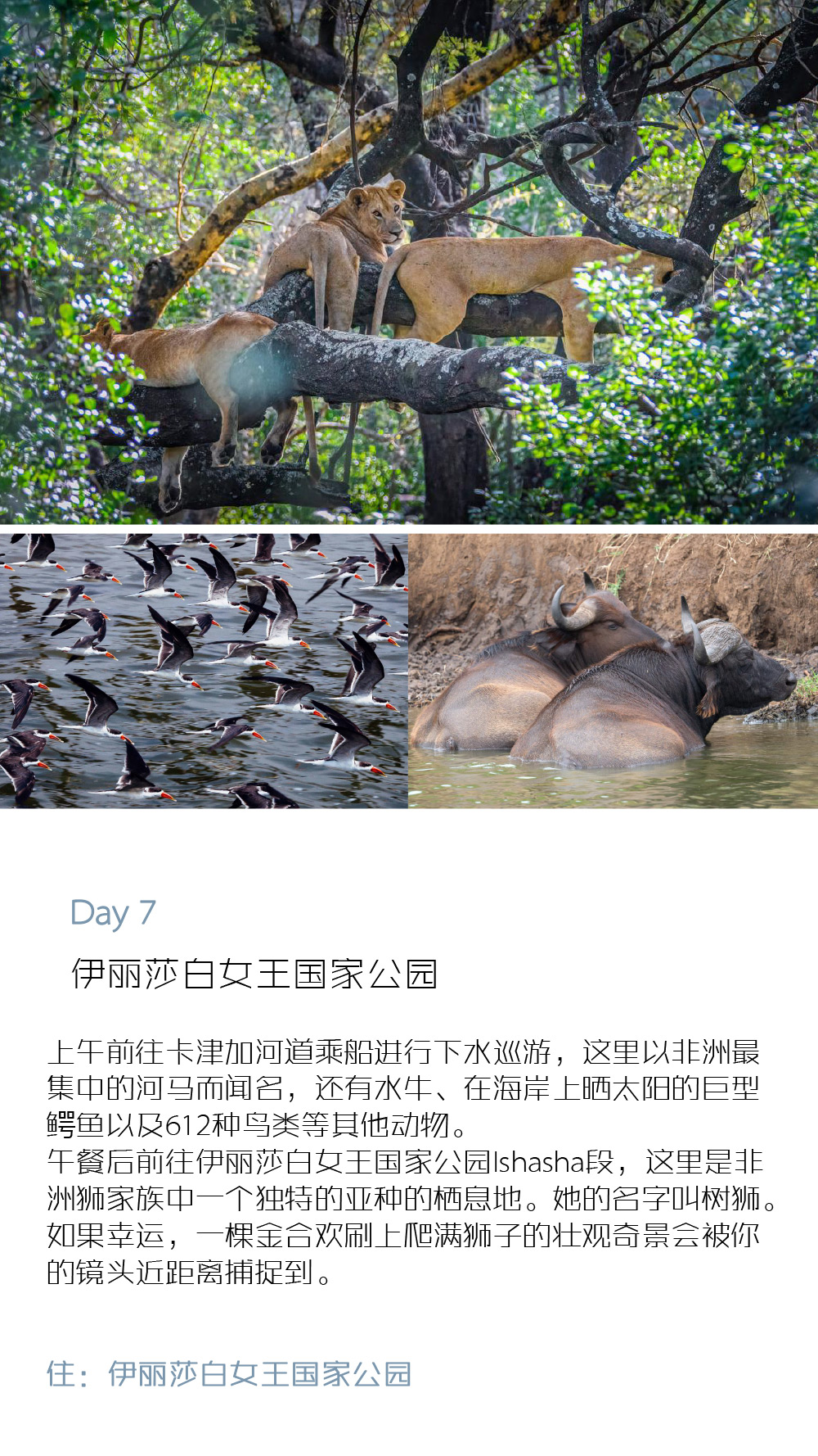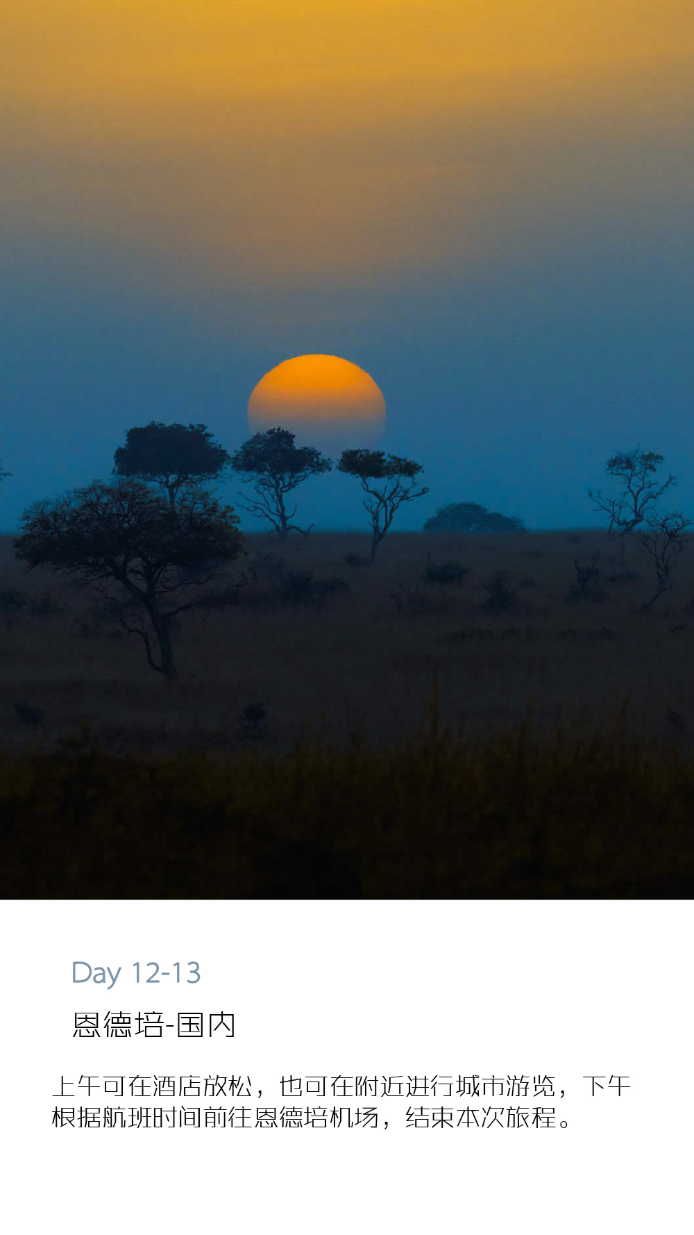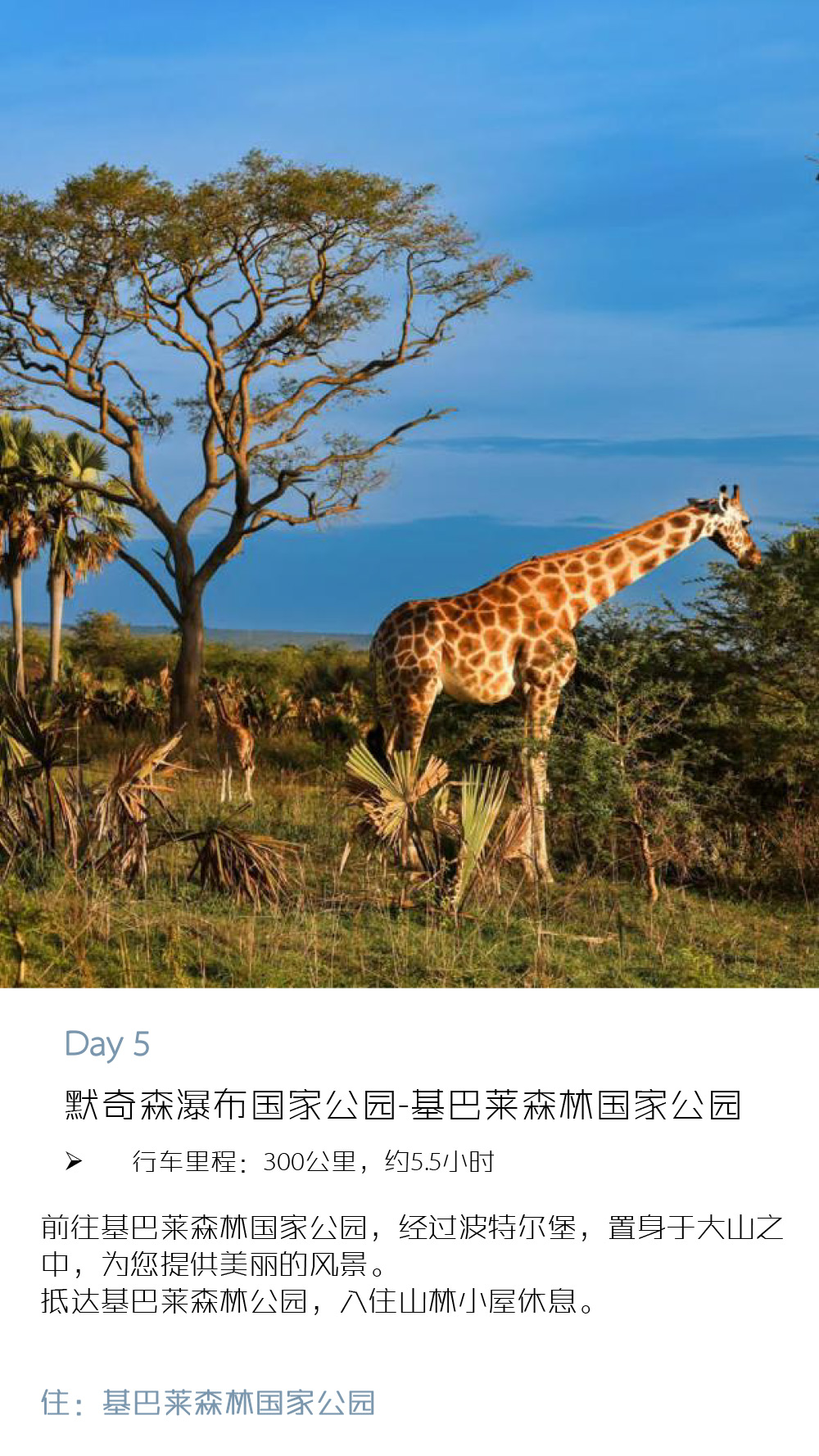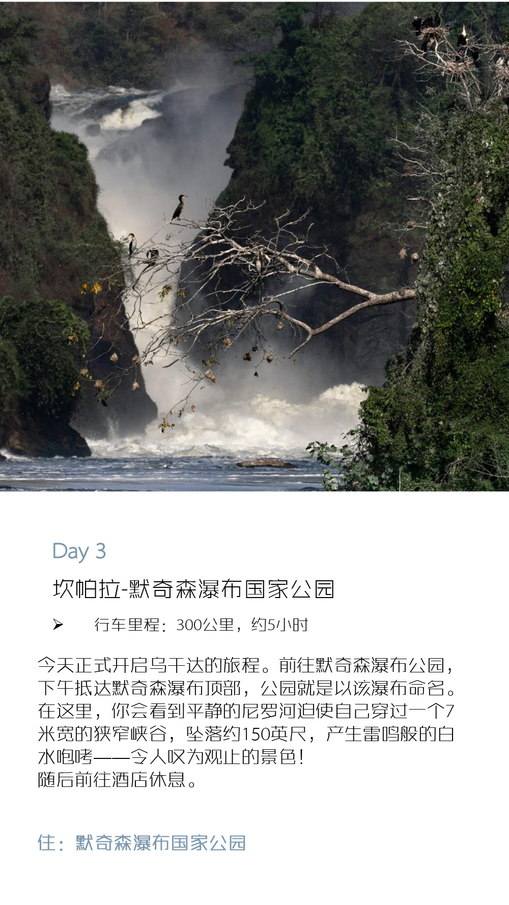 布温迪&基巴莱两处猩猩家园追寻人类近亲踪影;2晚连住默奇森瀑布公园,并进行原始河道巡游;乌干达4大国家公园+本尼奥,尼湖全景式深度游览;走进当地多彩民族的风情世界;下榻在国家公园内的奢牌酒店;品尝乌干达传统美食;全程开顶四驱越野车,美 容皆安排窗边位置