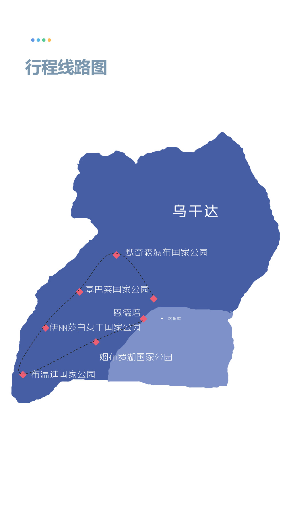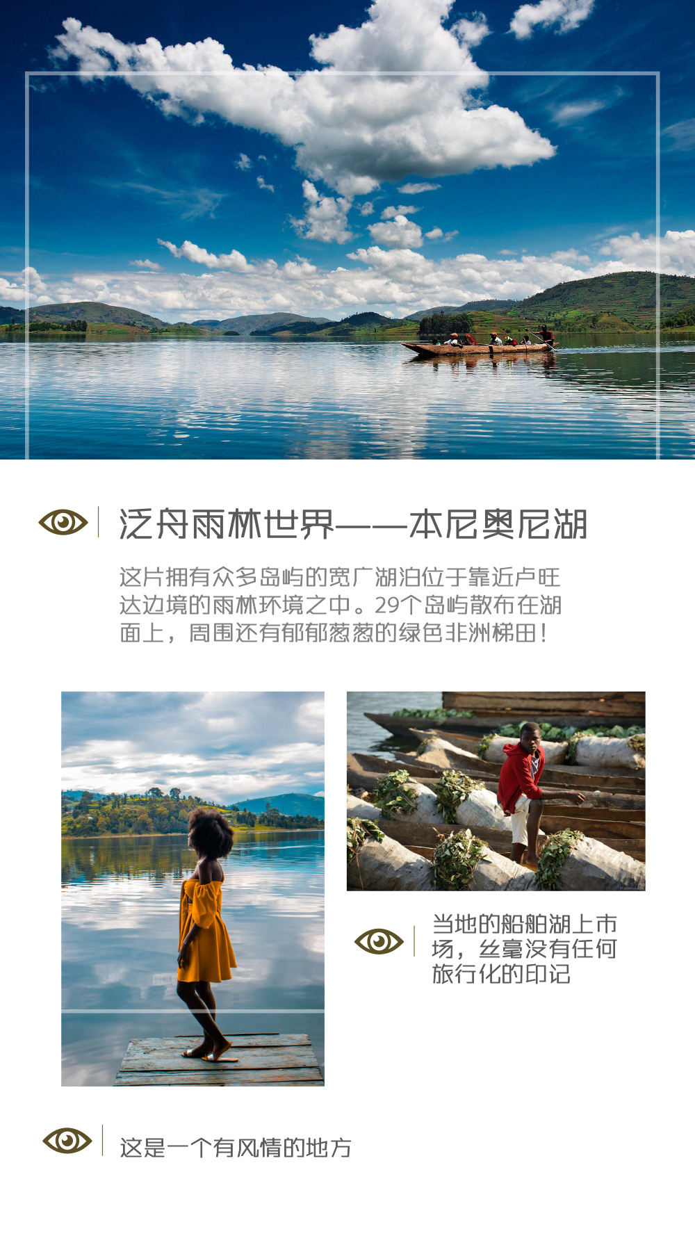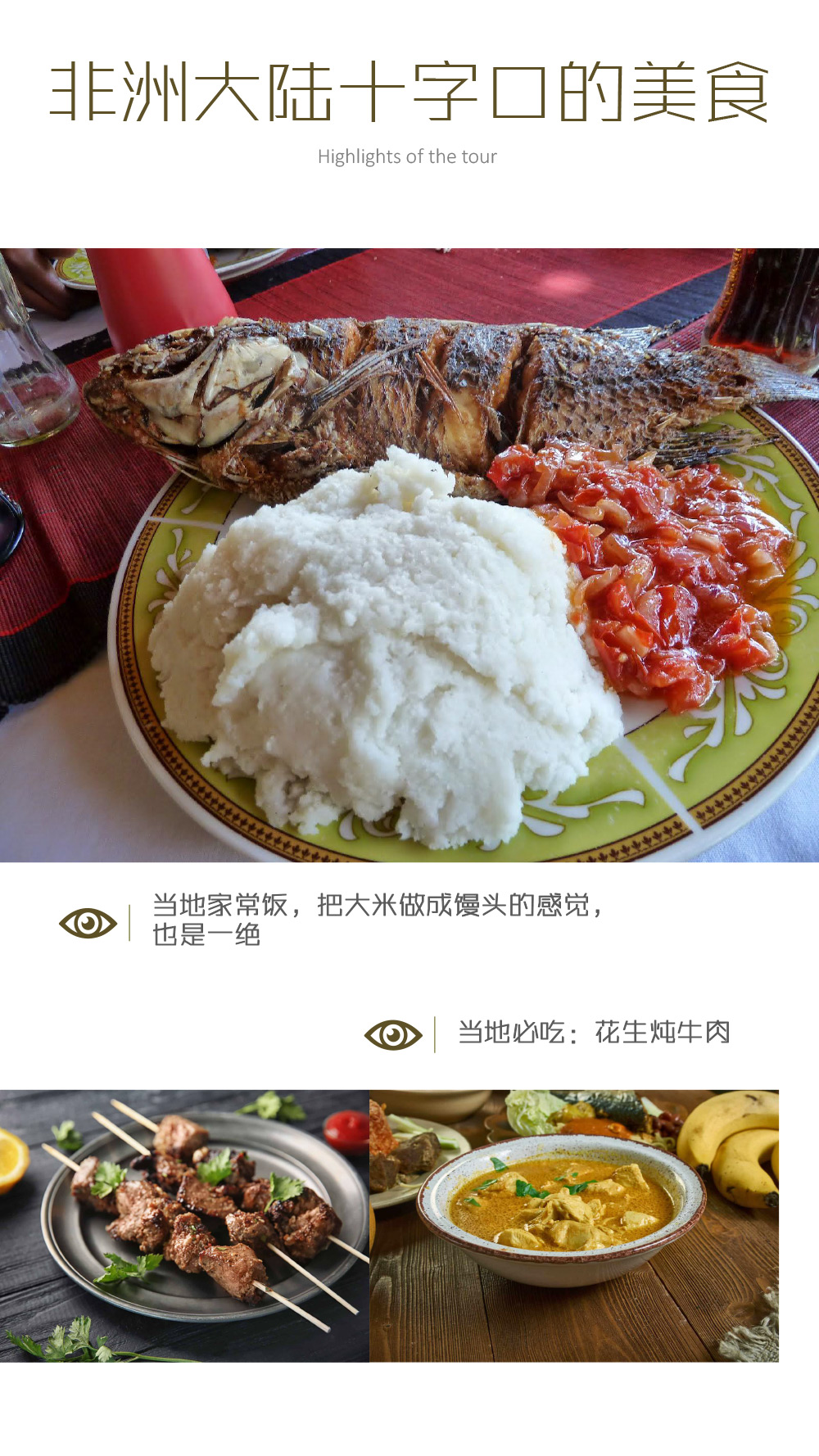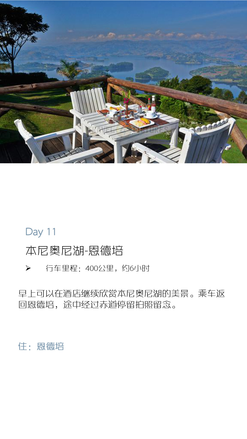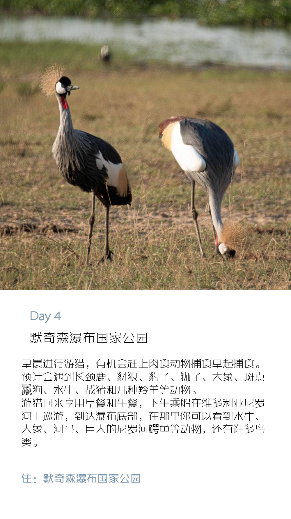 布温迪&基巴莱两处猩猩家园追寻人类近亲踪影;2晚连住默奇森瀑布公园,并进行原始河道巡游;乌干达4大国家公园+本尼奥,尼湖全景式深度游览;走进当地多彩民族的风情世界;下榻在国家公园内的奢牌酒店;品尝乌干达传统美食;全程开顶四驱越野车,美 容皆安排窗边位置