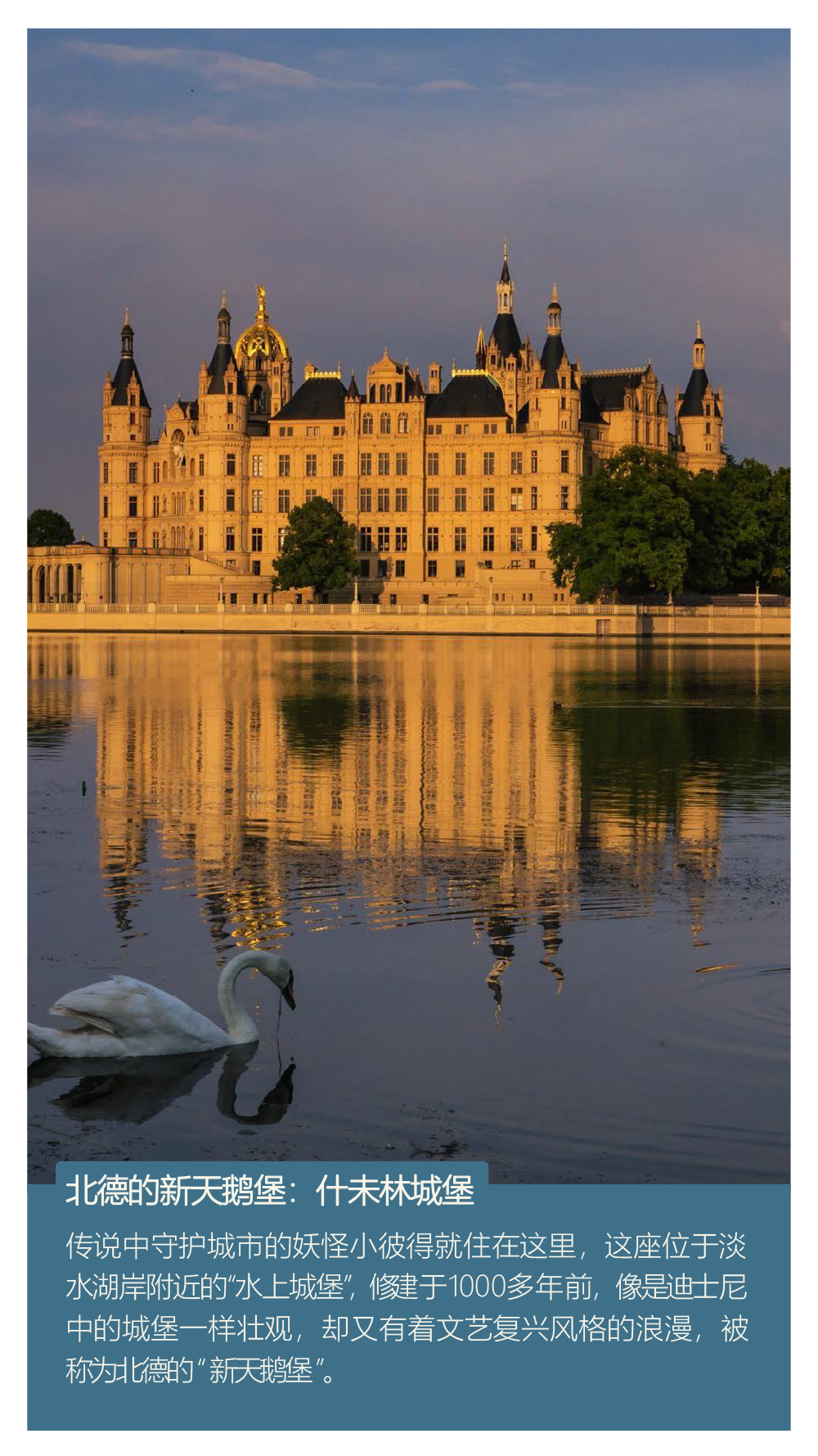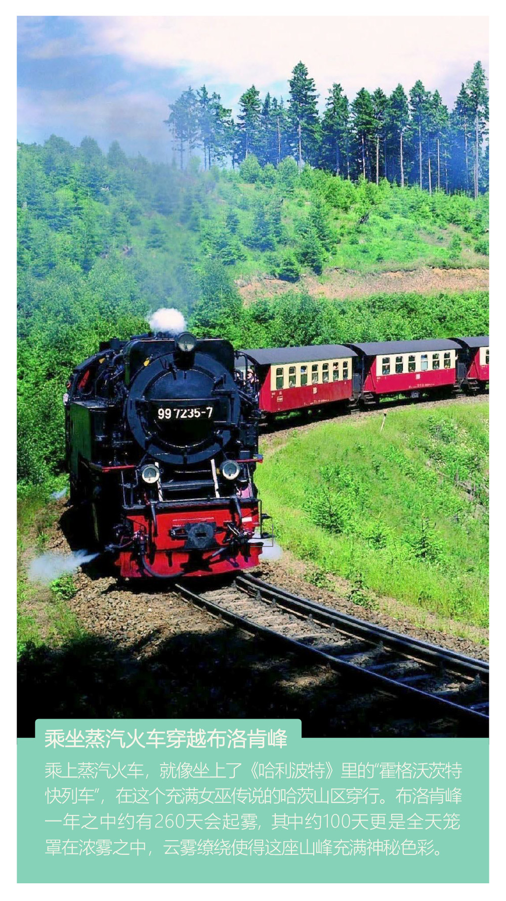小红帽的故乡:阿尔斯费尔德;乘坐蒸汽火车穿越布洛肯峰;巫婆镇:中世纪古镇魔幻探秘;北德的新天鹅堡:什未林城堡;德国国王的游乐场:无忧宫;精灵的森林住所:吕贝瑙羊角村。
